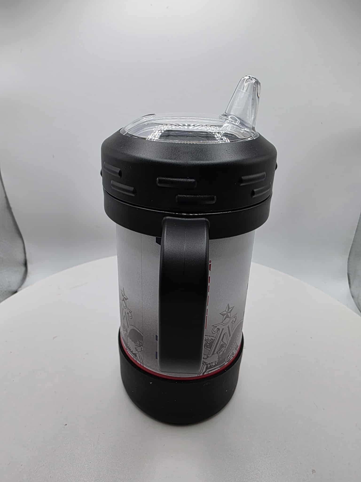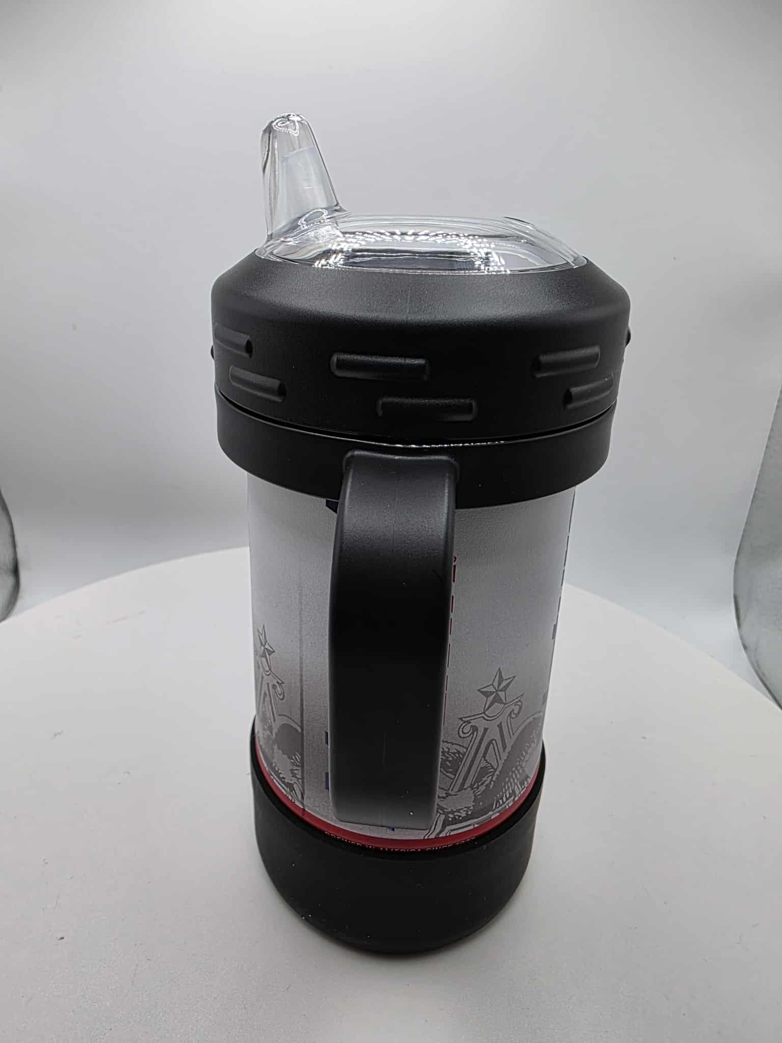 Polar Camel Sippy Cups are 10 oz. double wall insulated powder coated cups featuring removable handles, a silicone boot, and spill proof lid. The screw on lid features a hard plastic spout with a rubber leak proof valve. The cup can be used with or without the heavy-duty plastic handles that attach to the lid. They offer plenty of space for personalization and can be taken apart for easy cleaning. The plastic lid may need an occasional deep cleaning.