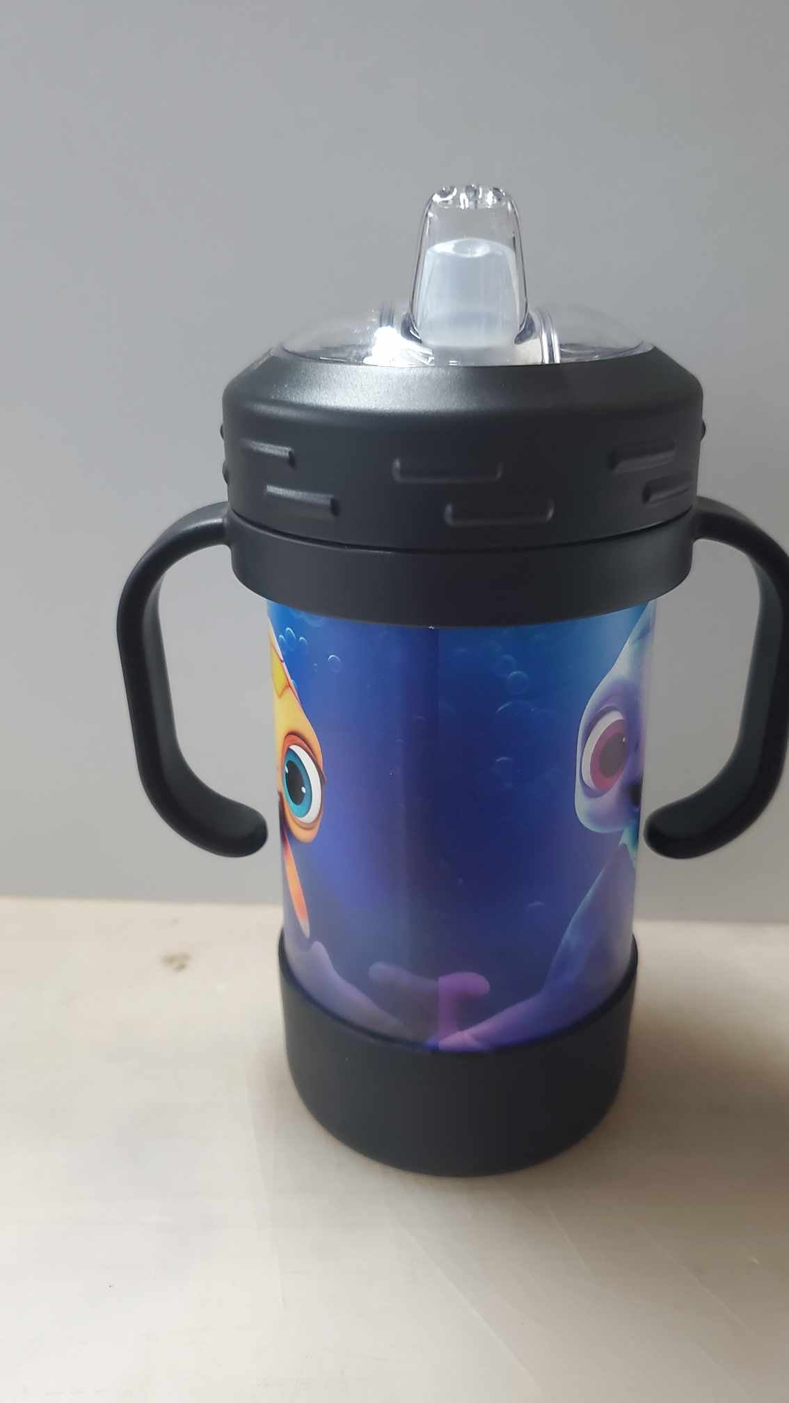 Polar Camel Sippy Cups are 10 oz. double wall insulated powder coated cups featuring removable handles, a silicone boot, and spill proof lid. The screw on lid features a hard plastic spout with a rubber leak proof valve. The cup can be used with or without the heavy-duty plastic handles that attach to the lid. They offer plenty of space for personalization and can be taken apart for easy cleaning. The plastic lid may need an occasional deep cleaning.